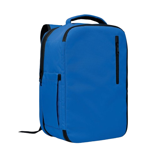 Handbagage rugzak van 600D RPET polyester met 180° opening. Voorzien van een hoofdvak met twee open vakken, mesh indeling, gewatteerd 15” laptopvak en bagageriem.