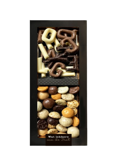 Feestelijk, verrassend en heerlijk om te delen! Verras collega’s, klanten of relaties met deze luxe XL vensterdoos gevuld met een vrolijke mix van mini chocoladeletters en chocolade kruidnoten in diverse smaken.