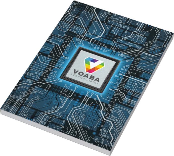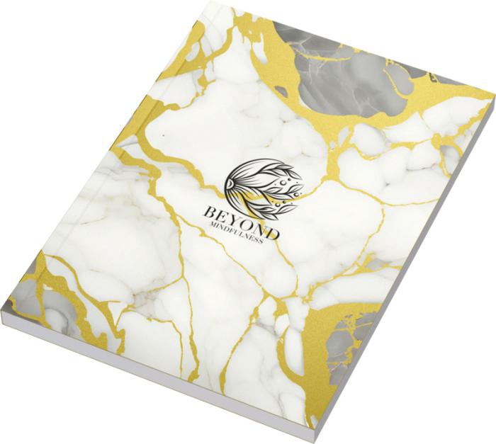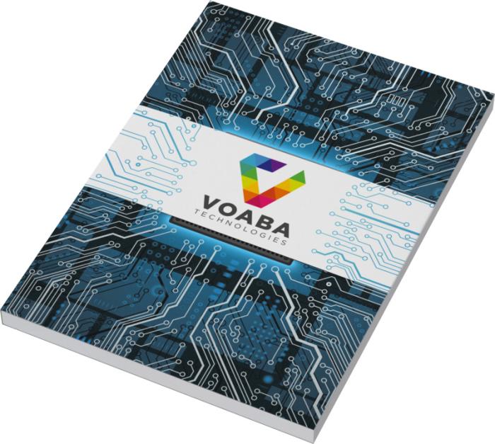 Met 100 vellen 80 g/m² FSC-gecertificeerd papier schrijft het notitieboek comfortabel en duurzaam. De pagina’s zijn standaard blanco, maar kunnen ook worden voorzien van gelinieerd, geruit of volledig gepersonaliseerd papier. De stevige metallic omslag van 300 g/m² karton is geheel full-colour te bedrukken – inclusief voorzijde, achterzijde en rug – ideaal voor opvallende branding.