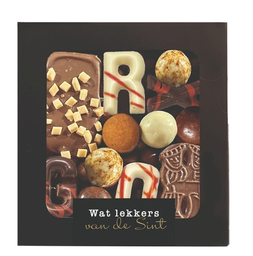Inhoud: 140 gram – Speculaas/melkchocolaatje, chocolade kruidnoten, melkchocolade plaatje met karamel fudge stukjes, mini chocolade letters.