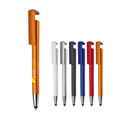 Moderne 3-in-1 balpen met stylus en telefoonstandaard. Een zeer hippe weggever in een strak design. Blauwschrijvende vulling.