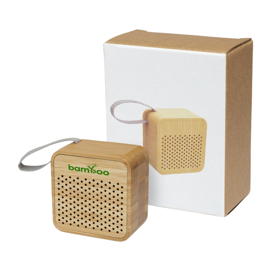Bamboe Bluetooth speaker met een 3W uitgang en kristalhelder geluid. Een compacte speaker met een ingebouwde 500 mAh batterij die tot 3 uur gebruik op maximaal volume mogelijk maakt. Bereik van Bluetooth 5.0 is tot 10 meter. Micro USB-oplaadkabel inbegrepen. Geleverd in een 100% FSC-gecertificeerde geschenkverpakking en voorzien van FSC-handleiding. Aangezien bamboe een natuurlijk product is, kan ieder item enigszins varieren in kleur en grootte, wat van invloed kan zijn op het uiterlijk van de speaker. Bamboe hout. Afmeting: 7x7x4 cm.Digitale print op de voorzijde mogelijk en gravering op alle vlakken.