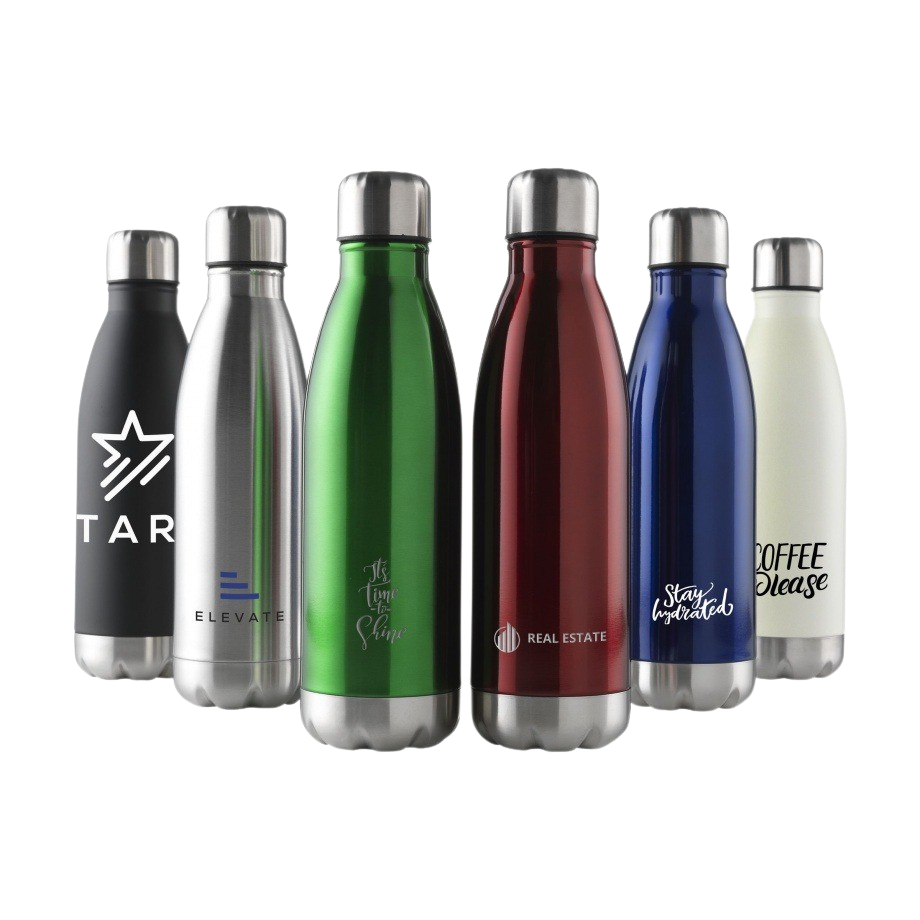 Dubbelwandige, RVS waterfles/thermosfles. Met lekvrije schroefdop. Uitgevoerd in metallic of met mooie toplaag in matte finish (zwart & wit). Geschikt voor het op temperatuur houden van koude of warme dranken. Inhoud 500 ml. Per stuk in doos verpakt. Afmeting: 26 cm hoog.