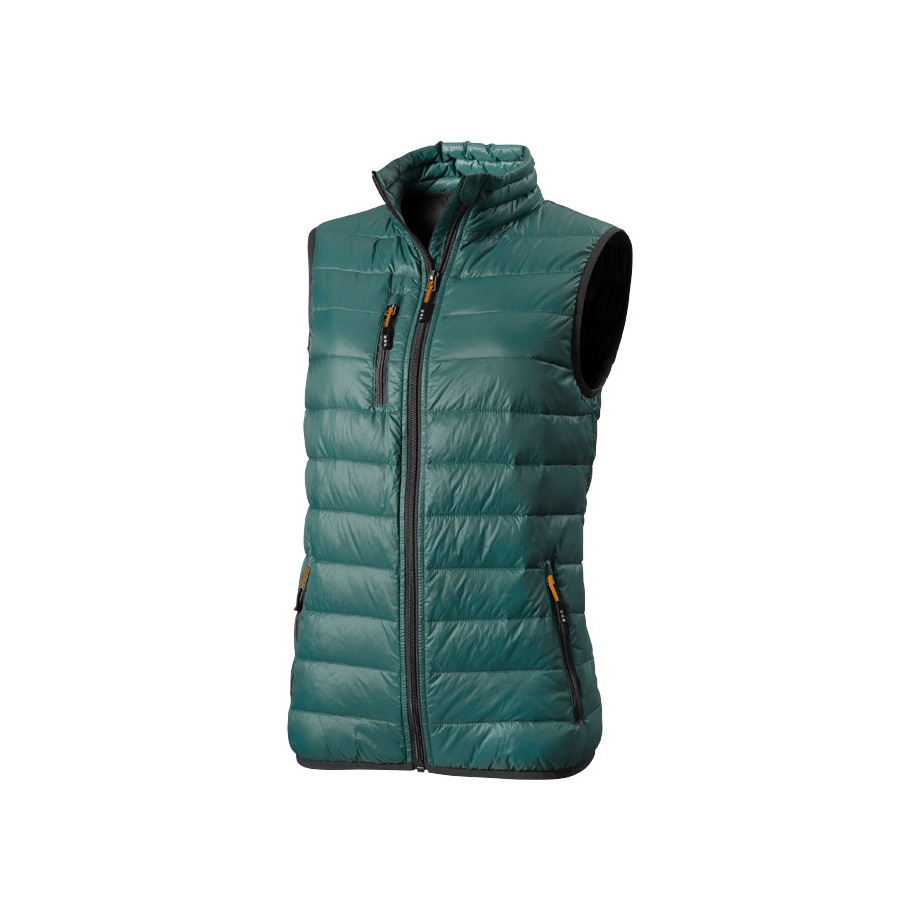 Fairview Lichte dons bodywarmer Dames. Downproof geperste stof. Hand- en borstzakken met rits. Stormflap aan binnenzijde met kinbescherming. Elastisch biesband aan de onderzijde en armsgaten. Waterafstotend, ademend en winddicht.reflecterend logo op achterzijde. Licht gewicht isolerende bodywarmer. Bodywarmer versie van het Reddot award winnende Scotia jack.