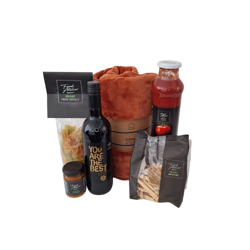 Een zacht recycled plaid in de kleur pottersclay, een goed glas biologische rode wijn, en een heerlijke maaltijd met bio pasta, passata, tapenade en dipsticks – dit pakket draait om rust, smaak en aandacht.