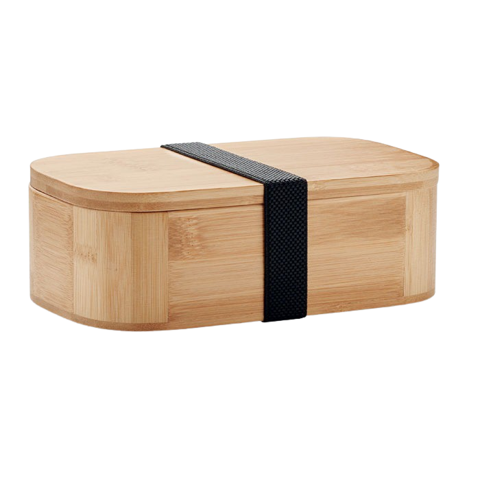 Bamboe lunchbox met uitneembaar tussenschot en nylon sluitelastiek. Alleen geschikt voor droge voeding en snacks. Inhoud: 1 L. Afmeting: 21x12x6,5 cm. Gravering en bedrukking op verschillende zijdes mogelijk.