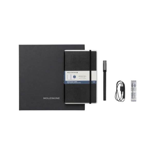 Ellipse smart schrijfset. De Smart schrijfset bevat de Pen Ellipse smart pen en een groot gelinieerd notitieblok met speciaal Ncoded papier. Samen met de Moleskine Notes App schrijf je op de pagina’s van het notitieblok met de Pen Ellipse voor direct gedigitaliseerde notities die kunnen worden gewijzigd, getrancribeerd, georganiseerd en opgeslagen op het apparaat van jouw keuze. Inbegrepen in de verpakking: Notitieblok met speciaal papier dat is gemaakt om te werken met Pen in ruled layout, Pen Ellipse smartpen, USB-kabel voor het opladen van de smartpen, 1 inktvulling, Volant XS starter dagboek en gebruikshandleiding. De Smart schrijfset Ellipse werkt met alle andere Moleskine notitieblokken en Smart dagboeken/agenda’s. PP – polypropyleen.