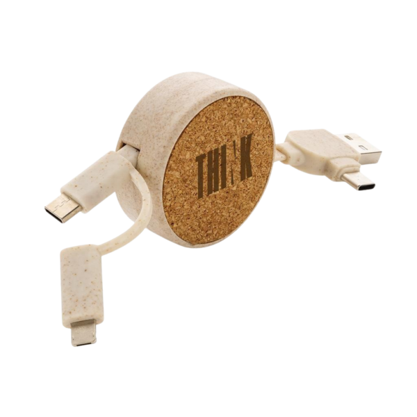 Uniek ontwerp intrekbare kabel waarmee u elk type item kunt opladen vanaf elk type USB-bron. Gemaakt van kurk en tarwestro (35%) gemengd met ABS en PVC-vrije TPE-kabel. Door de type C input is de kabel perfect voor nieuwere generatie telefoonladers en macbook computers die alleen type C output hebben. De kabel heeft ook een normale USB A-ingang. Uitgang: type C en dubbelzijdige connector voor IOS- en Android-apparaten. Max kabellengte: 100 cm. Artikel 100% PVC-vrij. Afmeting: 2x5x14 cm.