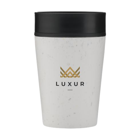 Dubbelwandige, circulaire herbruikbare koffie to-go beker met deksel. De buitenste isolerende laag van deze beker is gemaakt van gebruikte gerecyclede single-use papieren koffiebekers. Door de isolerende werking blijft je warme drank langer warm en koude drank langer koel. Het deksel is ontworpen met gepatenteerde 360-graden technologie, waarmee je vanuit elke hoek kunt nippen. De koffiebeker kun je met één hand en één klik openen en sluiten. Ideaal voor onderweg.