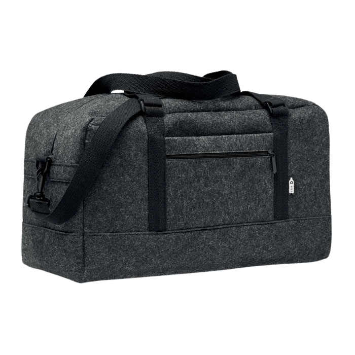 Sport-/ weekendtas van RPET vilt met voorvak met rits, canvas handvatten en afneembare verstelbare schouderriem.