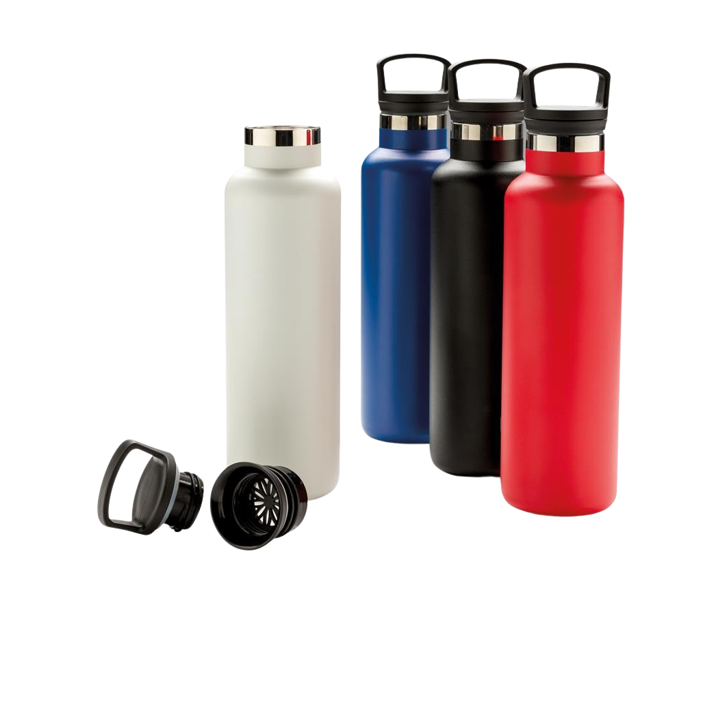 Dubbelwandige vacuum geisoleerde fles met poedercoating. 2-in-1 deksel met filter; perfect voor hete thee of fruitwater. Standaard mondopening ideaal voor nippen en toevoegen van ijsblokjes. Geweldige fles voor ieder seizoen. 304 RVS binnenkant en 201 RVS buitenkant. Houdt drankjes tot 5 uur warm en 15 uur koud. Inhoud: 600ml.