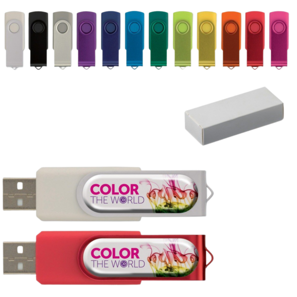 De populaire USB 2.0 flash drive met aluminium draaigedeelte. Leverbaar in vele kleuren en te personalizeren met een doming. Vanaf 2Gb leverbaar.
